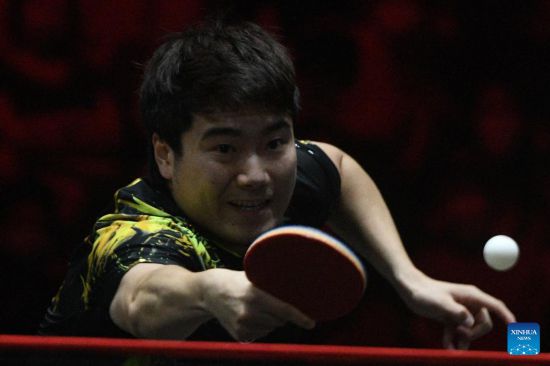 Liang Jingkun of China hits a return during the men's singles semifinal against Ma Long of China at the World Table Tennis (WTT) Singapore Smash 2022 in Singapore, March 19, 2022. (Photo by Then Chih Wey/Xinhua)