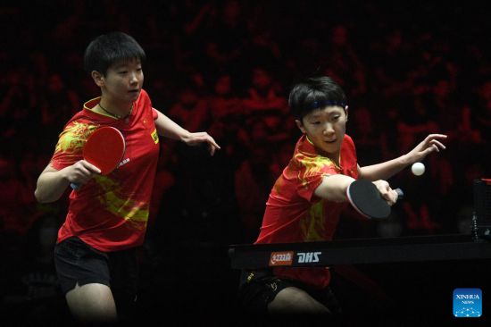 Wang Manyu (L)/Sun Yingsha of China compete during the women's doubles final match between Wang Manyu/Sun Yingsha of China and Hayata Hina/Ito Mima of Japan at the World Table Tennis (WTT) Singapore Smash 2022 in Singapore, March 19, 2022. (Photo by Then Chih Wey/Xinhua)