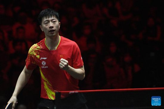 Ma Long of China reacts during the men's singles semifinal against Liang Jingkun of China at the World Table Tennis (WTT) Singapore Smash 2022 in Singapore, March 19, 2022. (Photo by Then Chih Wey/Xinhua)