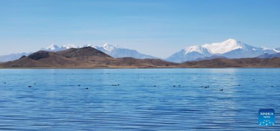 Photo taken with a mobile phone shows the scenery of the Yamzbog Yumco Lake in Shannan, southwest China's Tibet Autonomous Region, March 19, 2022. (Xinhua/Shen Hongbing)