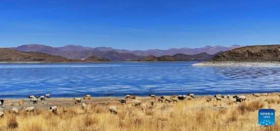 Photo taken with a mobile phone shows sheep on the south bank of the Yamzbog Yumco Lake in Shannan, southwest China's Tibet Autonomous Region, March 19, 2022. (Xinhua/Shen Hongbing)