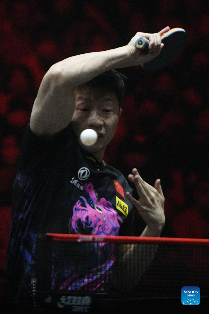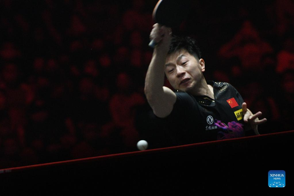 Ma Long of China hits a return during the men's singles final match against his compatriot Fan Zhendong at the World Table Tennis (WTT) Singapore Smash 2022 in Singapore, March 20, 2022. (Photo by Then Chih Wey/Xinhua)