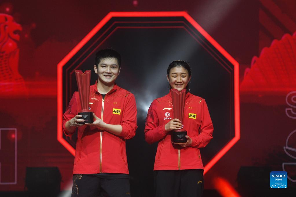 Fan Zhendong (L) of China and his compatiot Chen Meng, the winner of women's singles, pose for photos with trophies after the awarding ceremony for the men's singles at the World Table Tennis (WTT) Singapore Smash 2022 in Singapore, March 20, 2022. (Photo by Then Chih Wey/Xinhua)