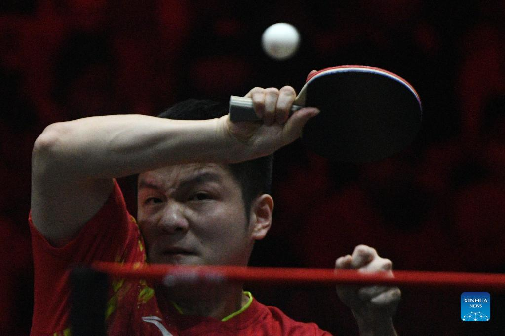 Fan Zhendong of China hits a return during the men's singles final match against his compatriot Ma Long at the World Table Tennis (WTT) Singapore Smash 2022 in Singapore, March 20, 2022. (Photo by Then Chih Wey/Xinhua)