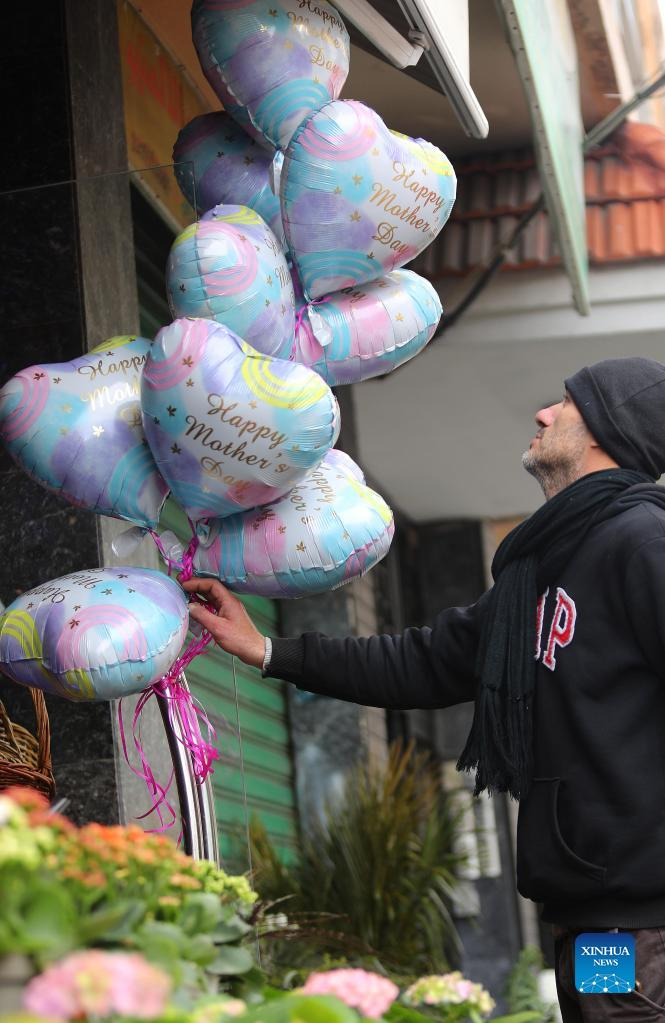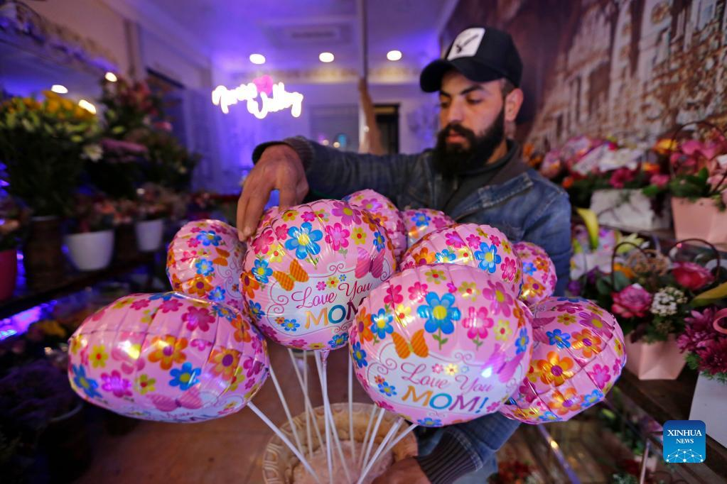 A man prepares balloons for Mother's Day in Beirut, Lebanon, on March 20, 2022. Lebanon and some other Arab countries celebrate Mother's Day on March 21. (Xinhua/Bilal Jawich)