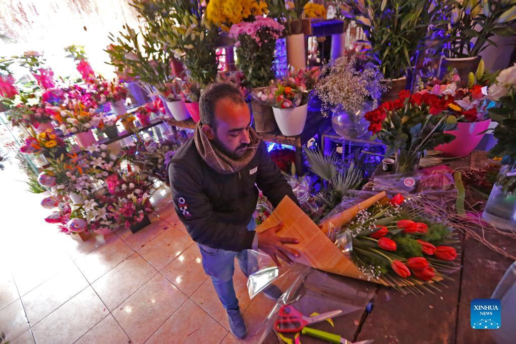 A man prepares flowers for Mother's Day in Beirut, Lebanon, on March 20, 2022. Lebanon and some other Arab countries celebrate Mother's Day on March 21. (Xinhua/Bilal Jawich)