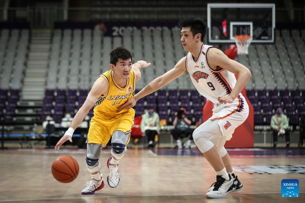 Zhu Junlong (R) of Zhejiang Lions vies with Kyranbek Makan of Shanghai Sharks during their 37th round match at the 2021-2022 season of the Chinese Basketball Association (CBA) league in Shenyang of northeast China's Liaoning Province, March 20, 2022. (Xinhua/Pan Yulong)
