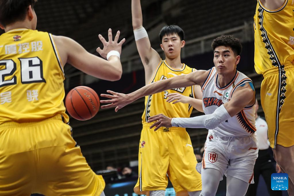 Li Tianrong (R) of Shanghai Sharks passes the ball during the 37th round match between Shanghai Sharks and Zhejiang Lions at the 2021-2022 season of the Chinese Basketball Association (CBA) league in Shenyang of northeast China's Liaoning Province, March 20, 2022. (Xinhua/Pan Yulong)
