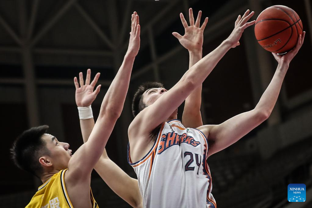 Ju Mingxin (C) of Shanghai Sharks goes to the basket during the 37th round match between Shanghai Sharks and Zhejiang Lions at the 2021-2022 season of the Chinese Basketball Association (CBA) league in Shenyang of northeast China's Liaoning Province, March 20, 2022. (Xinhua/Pan Yulong)