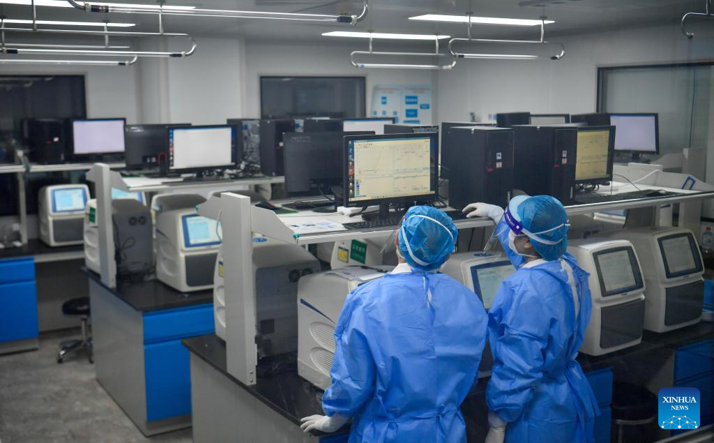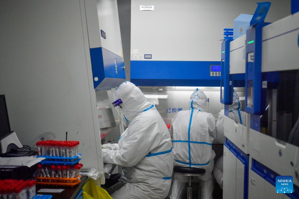 Staff members work at a nucleic testing base in Hebei District of Tianjin, north China, March 19, 2022. The base has a maximum daily testing capability of 15,000 tubes of 150,000 samples. (Xinhua/Sun Fanyue)
