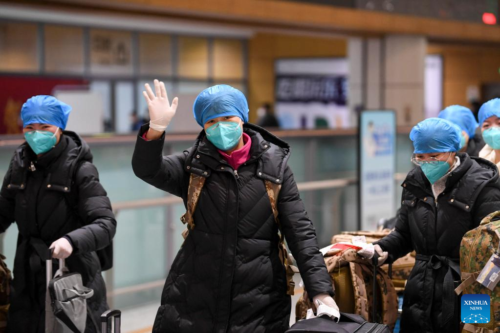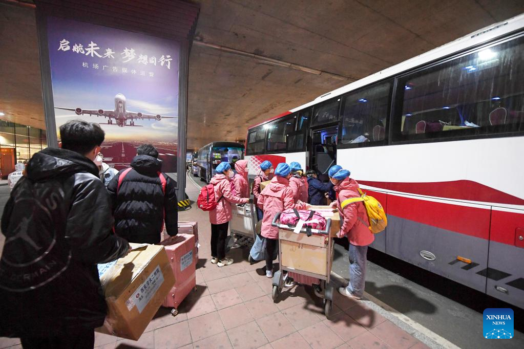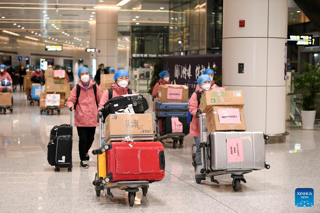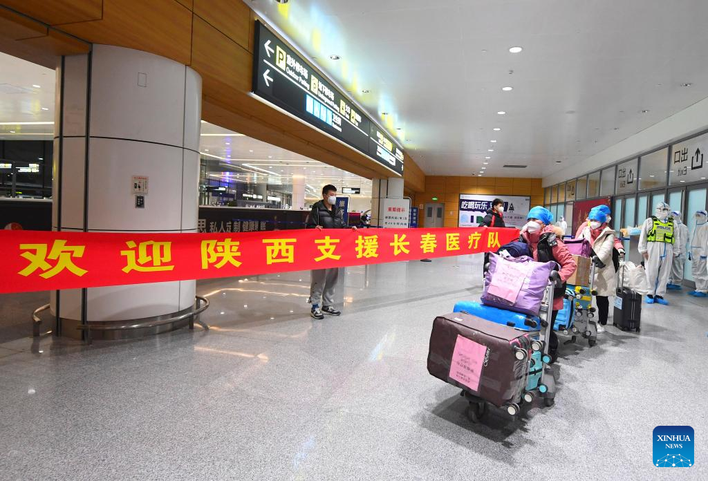 Members of a medical team from Shaanxi Province walk out of the Longjia airport in Changchun, northeast China's Jilin Province, March 20, 2022. The medical team from Shaanxi Province consisted of 265 members arrived in Changchun on Sunday. (Photo by Zhang Yang/Xinhua)