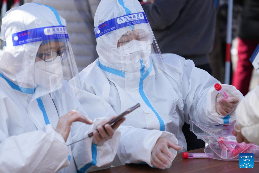 Medical workers collect nucleic acid samples at a testing site in Dongcheng District, Beijing, capital of China, March 21, 2022. (Xinhua/Ju Huanzong)