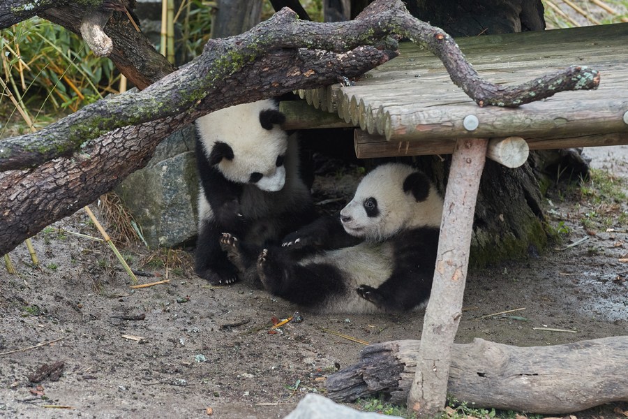 Giant panda twins are seen at Madrid Zoo Aquarium in Madrid, Spain, on March 21, 2022. (Xinhua/Meng Dingbo)
