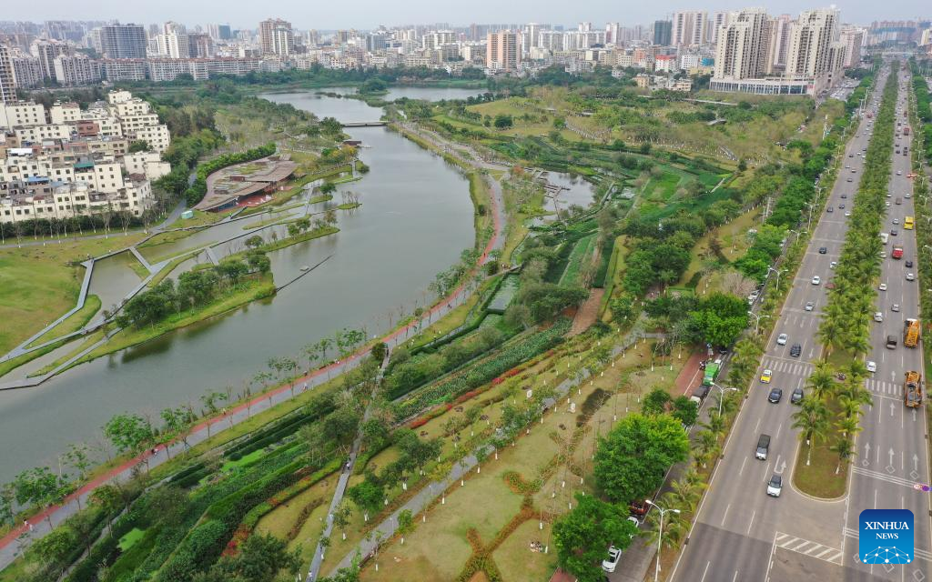 Aerial photo taken on March 19, 2022 shows a view of the Fengxiang wetland park of Meishe River in Haikou, south China's Hainan Province. Dubbed the "mother river" of Haikou, Meishe was recently listed among "the country's 11 most beautiful hometown rivers" by the Ministry of Water Resources.(Xinhua/Guo Cheng)