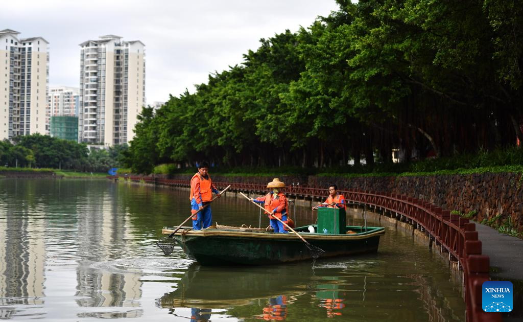 Workers pick up garbage floating on Meishe River in Haikou, south China's Hainan Province, July 10, 2017. Dubbed the "mother river" of Haikou, Meishe was recently listed among "the country's 11 most beautiful hometown rivers" by the Ministry of Water Resources.(Xinhua/Guo Cheng)
