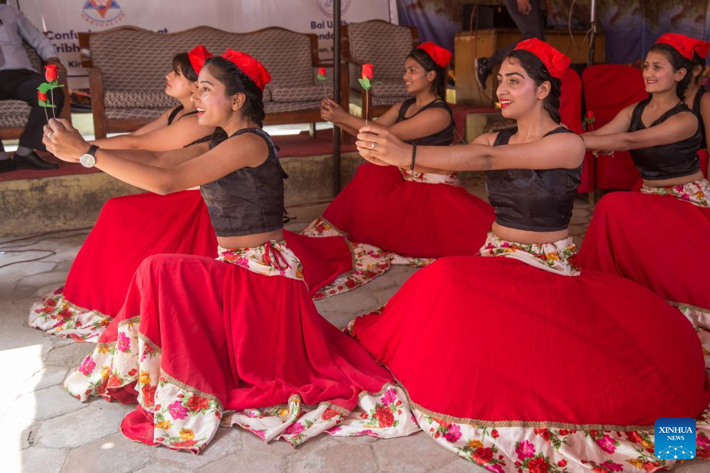 Students perform during an agreement signing ceremony on Chinese language teaching cooperation in Kathmandu, Nepal, March 21, 2022. The Confucius Institute at Nepal's Tribhuvan University signed a memorandum of agreement on Chinese language teaching cooperation with Bal Uddhar Secondary School in Kathmandu of Nepal Monday. (Photo by Hari Maharjan/Xinhua)