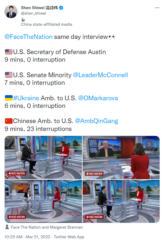 CGTN analyst Shen Shiwei tweeted a comparison of Brennan's "Face the Nation" interviews with American and Ukrainian officials on the same day to reveal that the anchor didn't interrupt those guests a single time.