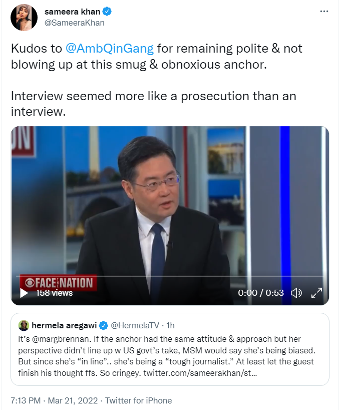 "Absolutely disrespectful. She was not interested to learn anything from the interview. She had a political agenda to fulfil. Understanding China's position is NOT allowed on mainstream US media," argued Twitter user CryptoMoon (@moondance0602). "In a free country we are only free to hear one tune: THE DRUMS OF WAR."