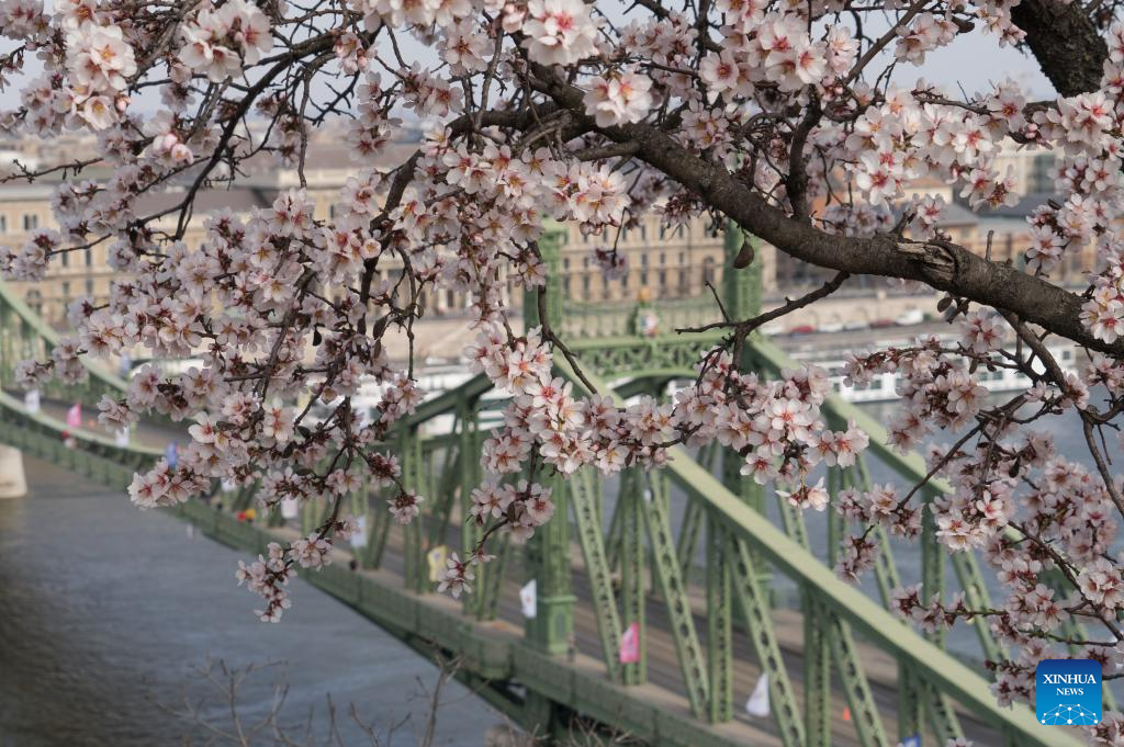 Blooming almond tree with the view of downtown of the city in the background is seen from a hill in Budapest, Hungary on March 20, 2022. (Photo by Attila Volgyi/Xinhua)