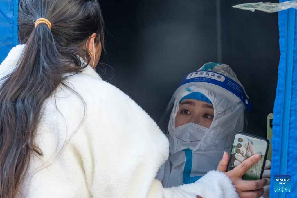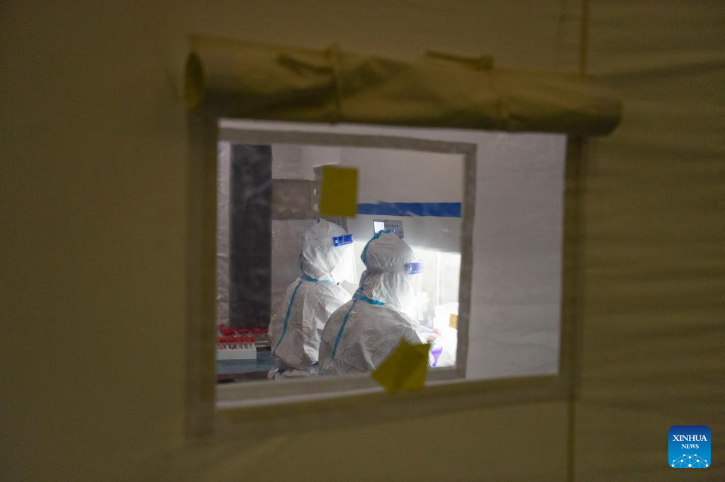 A medical worker collects samples for nucleic acid test at a testing site in Harbin, northeast China's Heilongjiang Province, March 20, 2022. In response to the COVID-19 outbreak, epidemic prevention and control workers in Harbin are on the front line, preventing the spread of the epidemic and protecting the health of citizens. (Xinhua/Xie Jianfei)
