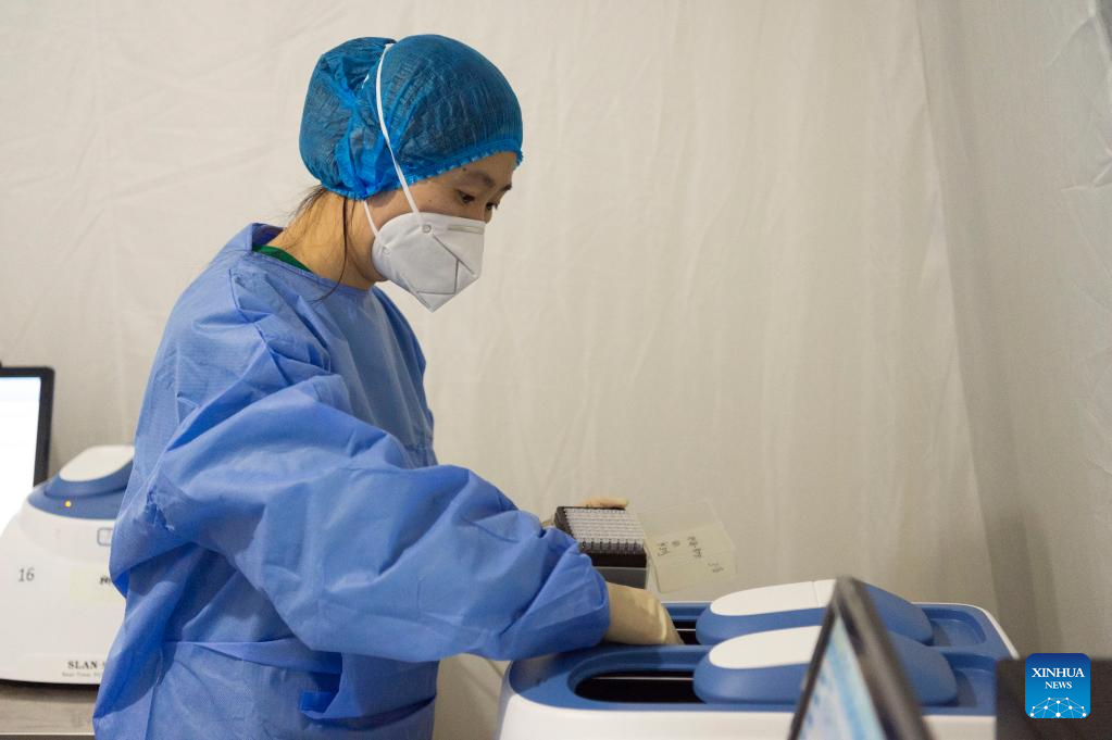A medical worker works at a mobile laboratory at a sports center in Harbin, northeast China's Heilongjiang Province, March 18, 2022. In response to the COVID-19 outbreak, epidemic prevention and control workers in Harbin are on the front line, preventing the spread of the epidemic and protecting the health of citizens. (Xinhua/Xie Jianfei)