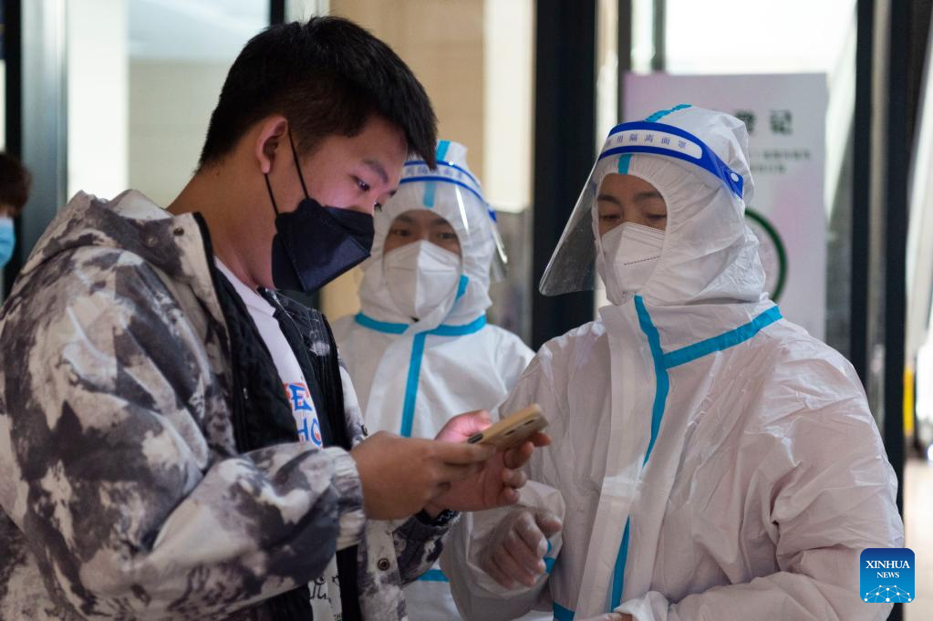 Staff members check people entering the Harbin Railway Station in Harbin, northeast China's Heilongjiang Province, March 21, 2022. In response to the COVID-19 outbreak, epidemic prevention and control workers in Harbin are on the front line, preventing the spread of the epidemic and protecting the health of citizens. (Xinhua/Xie Jianfei)
