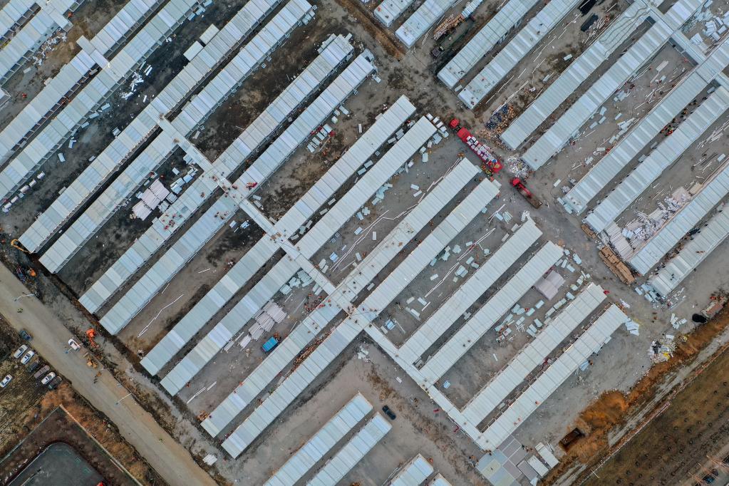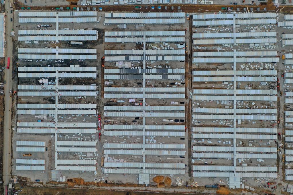 Aerial photo taken on March 20, 2022 shows temporary quarantine facilities under construction in Jilin City, northeast China's Jilin Province. (Xinhua/Zhang Nan)