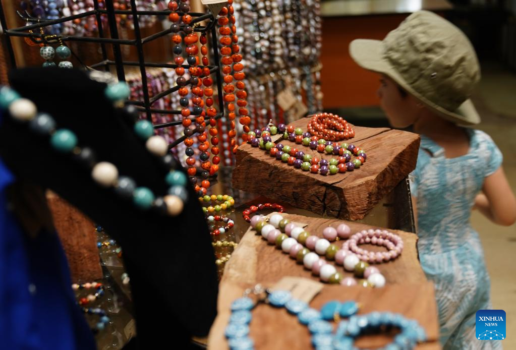 Ceramic products are shown at the Kazuri workshop in Nairobi, Kenya, on March 21, 2022. Kazuri, Swahili name for "small and beautiful," is a famous local brand for hand-made and hand-painted ceramic beads, jewelry and pottery in Kenya. The Kazuri workshop in Kazen has employed over 340 women, mostly single mothers. (Xinhua/Dong Jianghui)