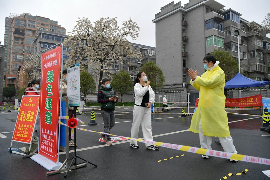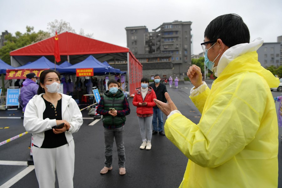 Li Huanqiu (1st L) uses sign language to guide hearing-impaired residents during a COVID-19 nucleic acid test at a testing site in Nanchang, east China's Jiangxi Province, March 21, 2022. (Xinhua/Peng Zhaozhi)