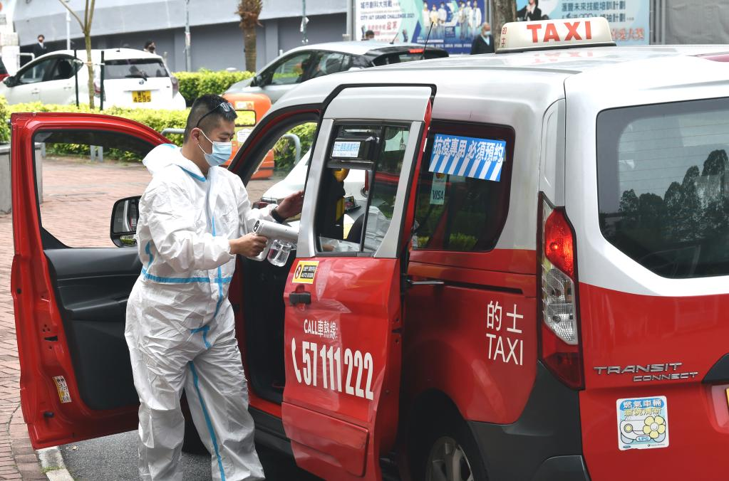A driver disinfects a taxi designated for epidemic control in Hong Kong, south China, March 22, 2022. (Xinhua/Lo Ping Fai)