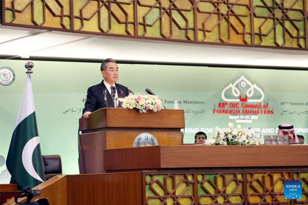 Chinese State Councilor and Foreign Minister Wang Yi (1st L) attends the 48th session of the Council of Foreign Ministers of the Organization of Islamic Cooperation (OIC) in Islamabad, capital of Pakistan, on March 22, 2022. (Xinhua/Jiang Chao)