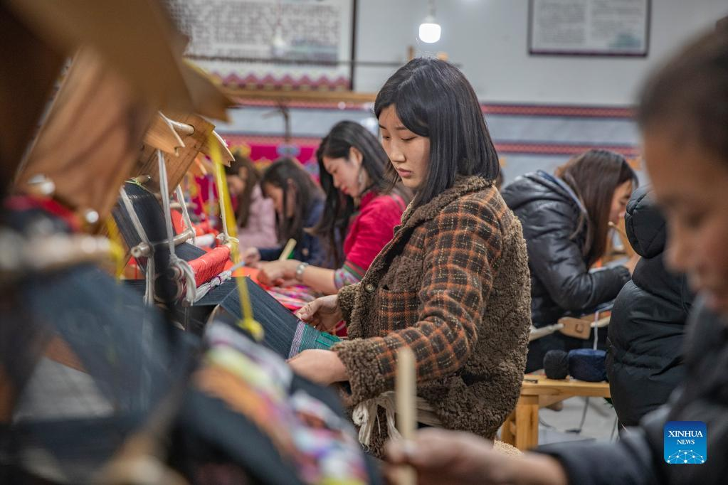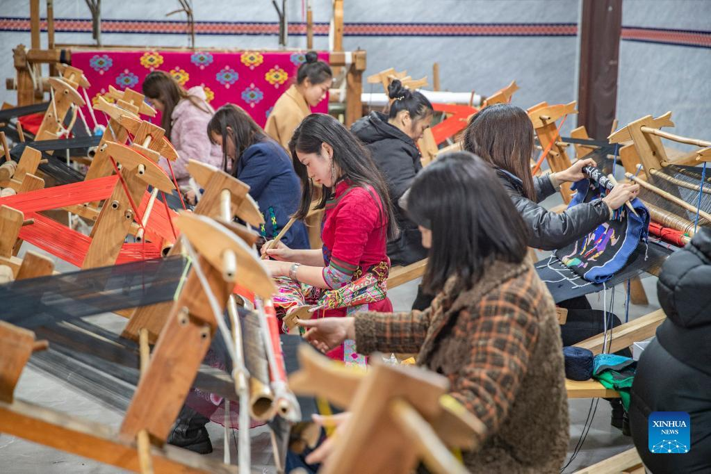 Women make products of Xilankapu, which is a kind of Tujia brocade, at a studio in Xiaonanhai Town of Qianjiang District in southwest China's Chongqing, March 22, 2022. Xilankapu, also known as "knitting Floral Bedclothes," was listed as national intangible cultural heritage in 2006. (Xinhua/Huang Wei)