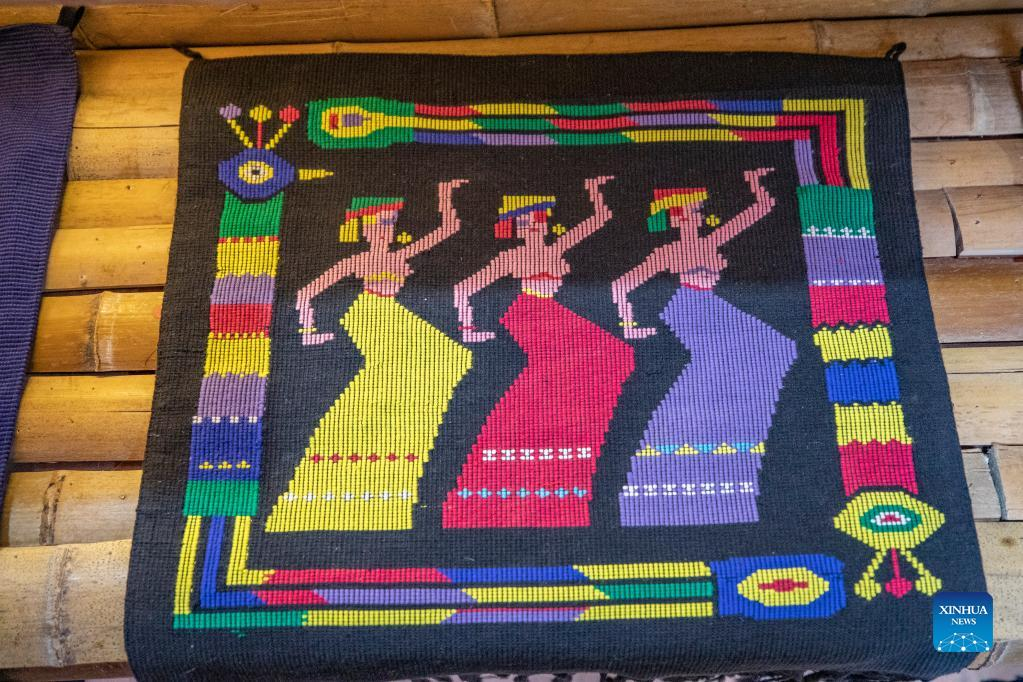 Photo taken on March 22, 2022 shows a product of Xilankapu, which is a kind of Tujia brocade, displayed at Xiaonanhai Town of Qianjiang District in southwest China's Chongqing. Xilankapu, also known as "knitting Floral Bedclothes," was listed as national intangible cultural heritage in 2006. (Xinhua/Huang Wei)