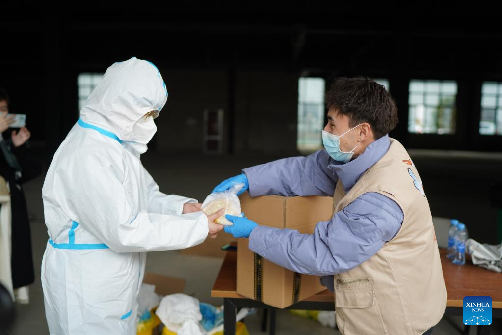 Miradil Mamtawla distributes food to medical workers in Nanchang, east China's Jiangxi Province, March 21, 2022. Miradil Mamtawla is from northwest China's Xinjiang Uygur Autonomous Region. The 29-year-old came to Nanchang in 2013 to attend university and started his own business after graduation. The COVID-19 outbreak in 2020 had a significant impact on his business. At the most difficult time, the local government provided loans and other supportive measures to help his business. After a resurgence of COVID-19 hit Nanchang this year, Miradil and his team joined a volunteer team, providing free meals to frontline essential workers. His team has already delivered over 1,000 naan buns. "The city of Nanchang helped me in the hardest time of my life, and now it's time for me to repay that kindness," he said. (Xinhua/Zhou Mi)