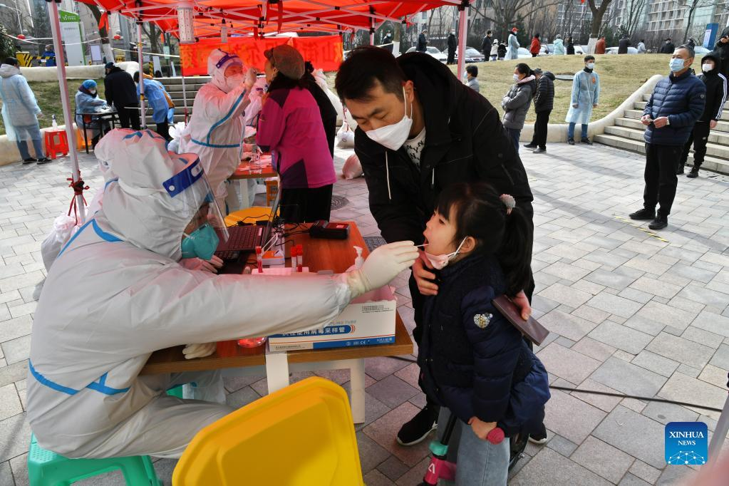 A medical worker takes a swab sample from a child for COVID-19 nucleic acid testing in Qingdao, east China's Shandong Province, March 22, 2022. (Xinhua/Li Ziheng)