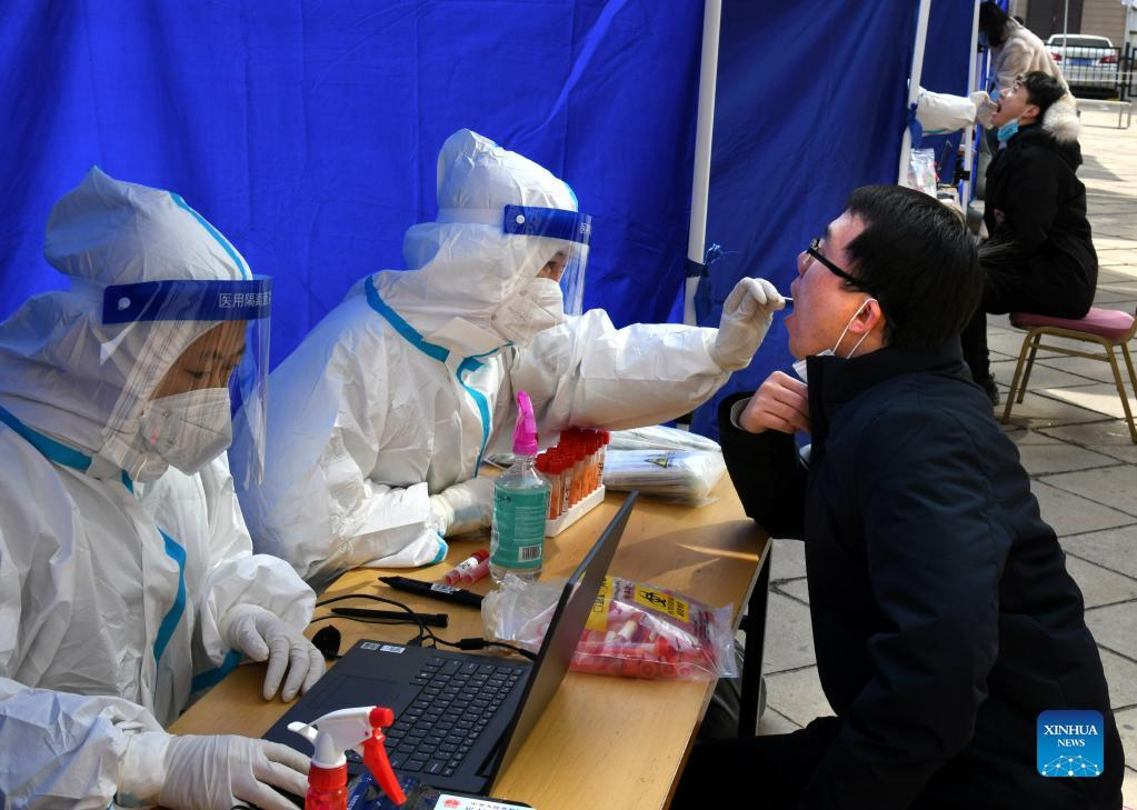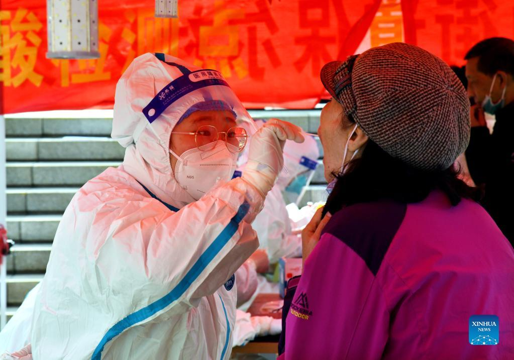 A medical worker takes a swab sample from a resident for COVID-19 nucleic acid testing in Qingdao, east China's Shandong Province, March 22, 2022. (Xinhua/Li Ziheng)