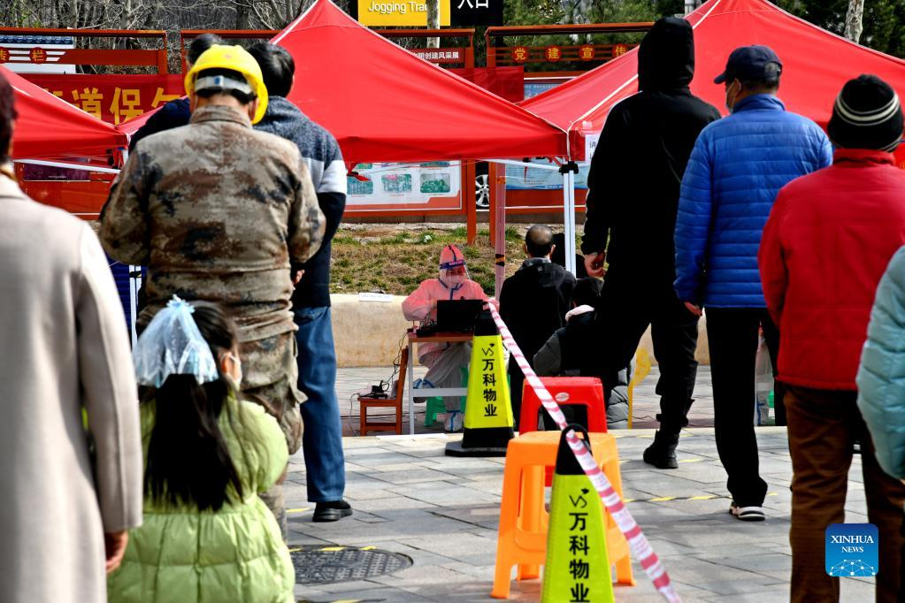 People queue up to take COVID-19 nucleic acid tests in Qingdao, east China's Shandong Province, March 22, 2022. (Xinhua/Li Ziheng)