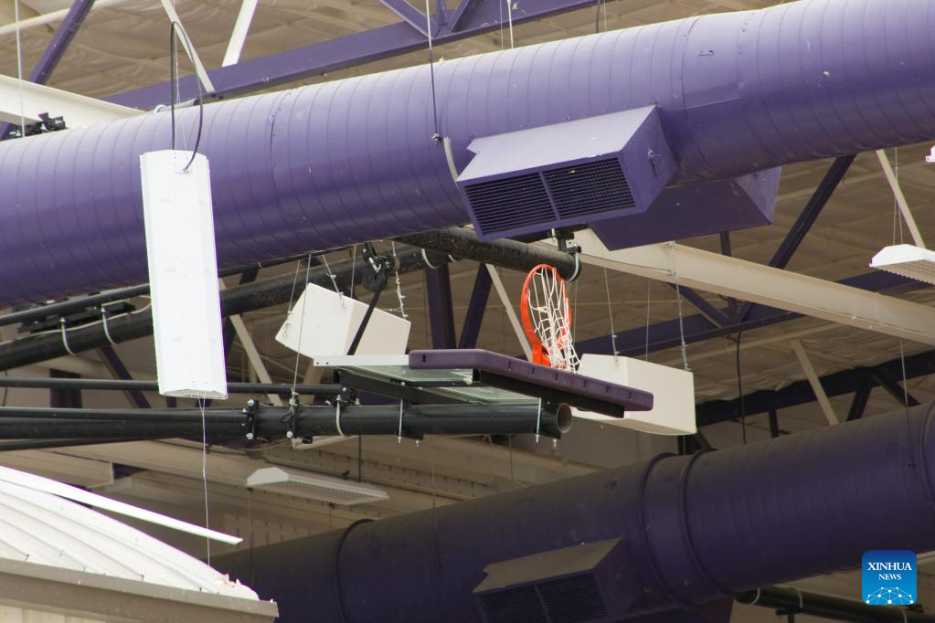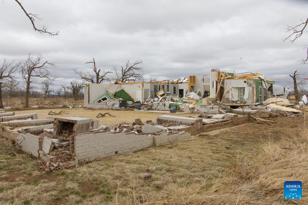 Photo taken on March 22, 2022 shows a school building damaged by a tornado in Jacksboro, northern Texas, the United States. Many people were injured after several tornadoes on Monday ripped through parts of the south-central U.S. states of Texas and Oklahoma, officials said. (Photo by Dan Tian/Xinhua)