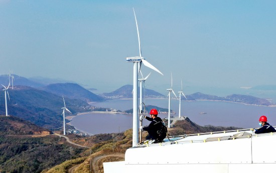Technicians carry out maintenance work on turbines at a wind farm in Zhoushan, Zhejiang province, in January. [PHOTO BY YAO FENG/FOR CHINA DAILY]