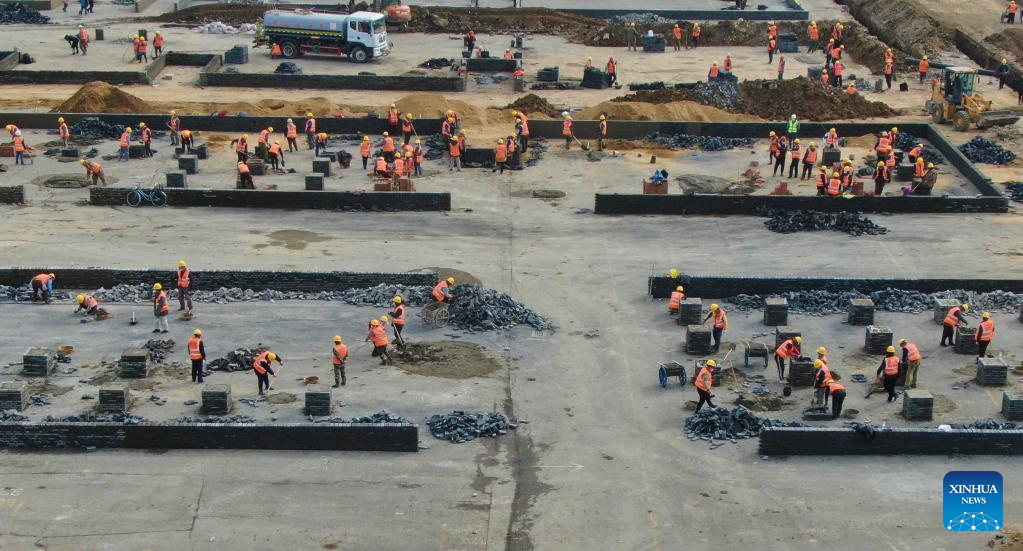 Aerial photo taken on March 22, 2022 shows the construction site of the health station at Shenyang International Exhibition Center in Shenyang, northeast China's Liaoning Province. The temporary hospital and health station at Shenyang International Exhibition Center started construction on March 20, 2022. (Xinhua/Yang Qing)