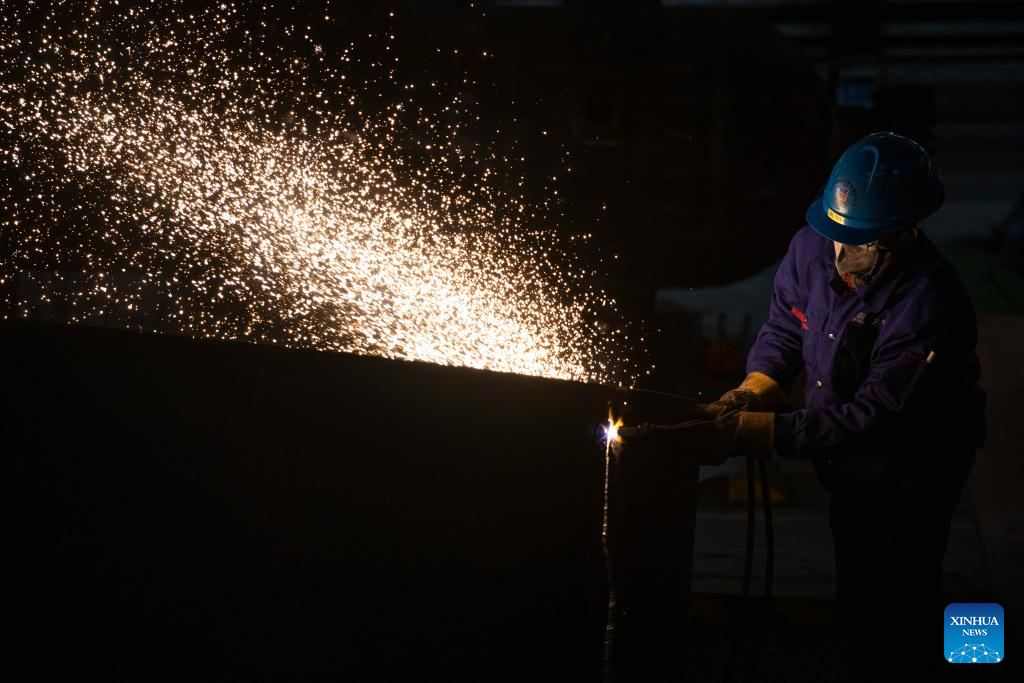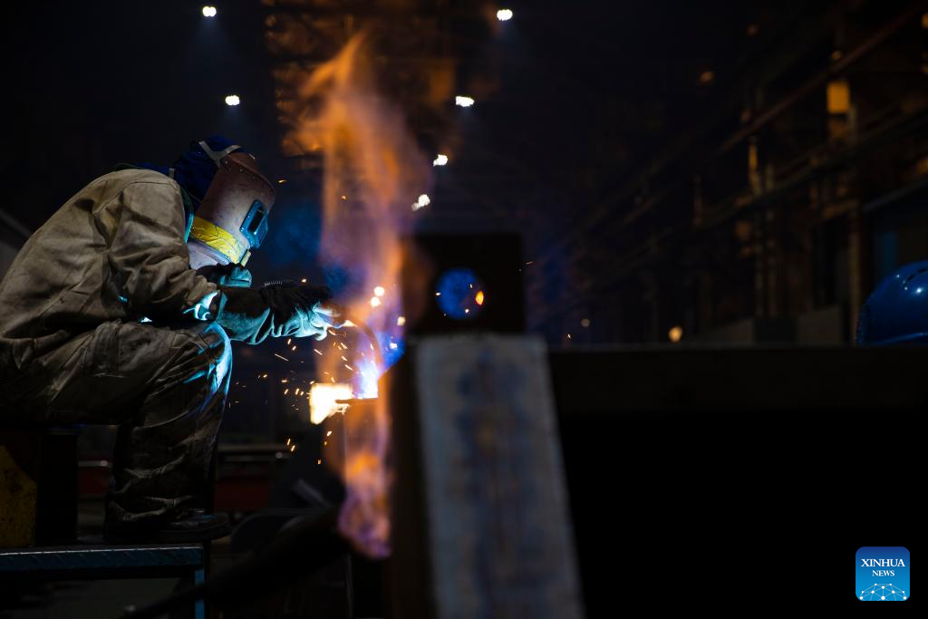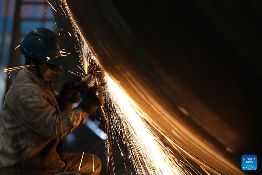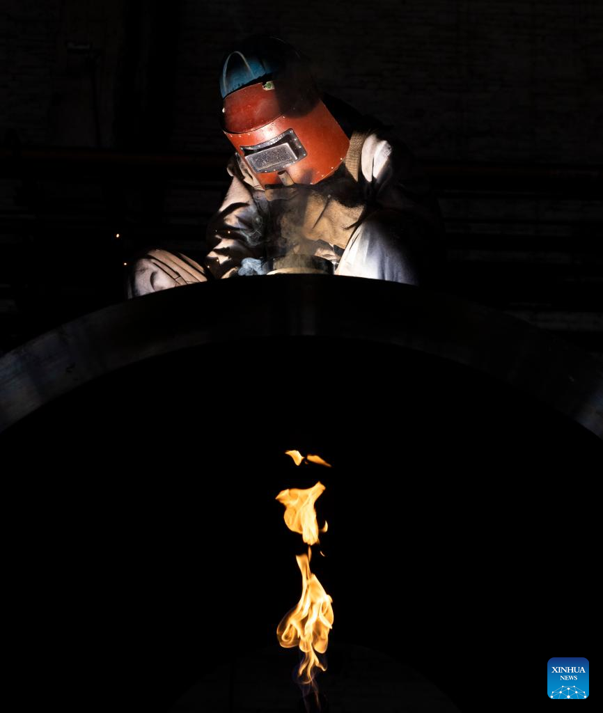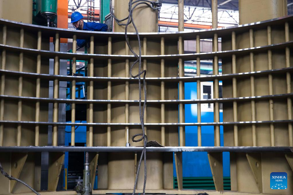 A staff member works at Harbin Boiler Company Ltd. of Harbin Electric Corporation in Harbin, northeast China's Heilongjiang Province, March 23, 2022. Manufacturing firms above a designated size have been facilitating production with epidemic control and prevention measures in Harbin, as an effort to minimize the impact of the COVID-19 on economic and social development. (Xinhua/Zhang Tao)