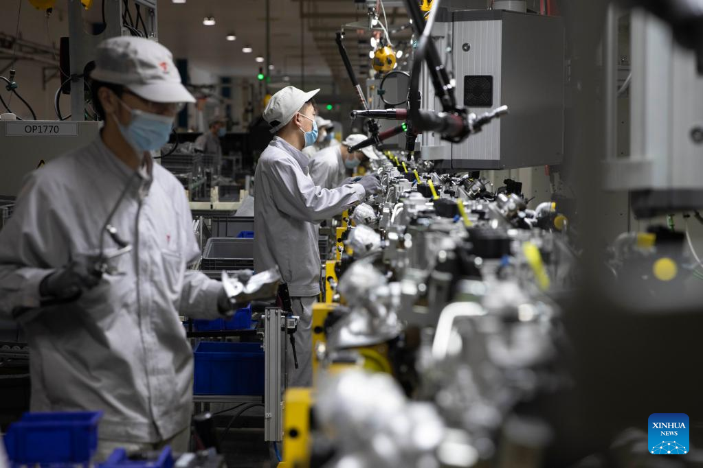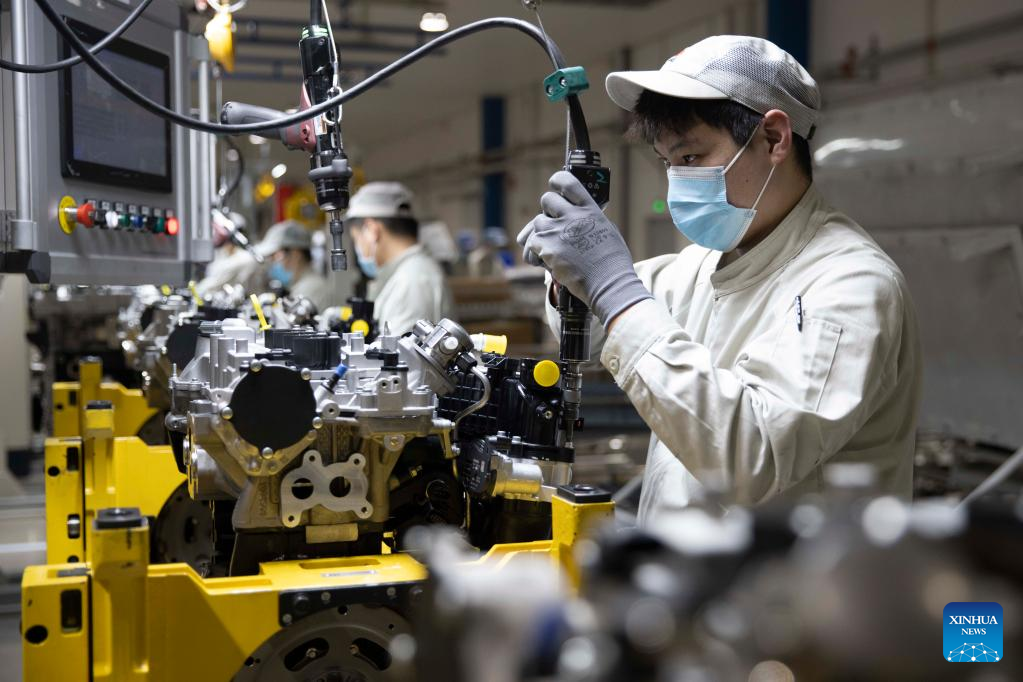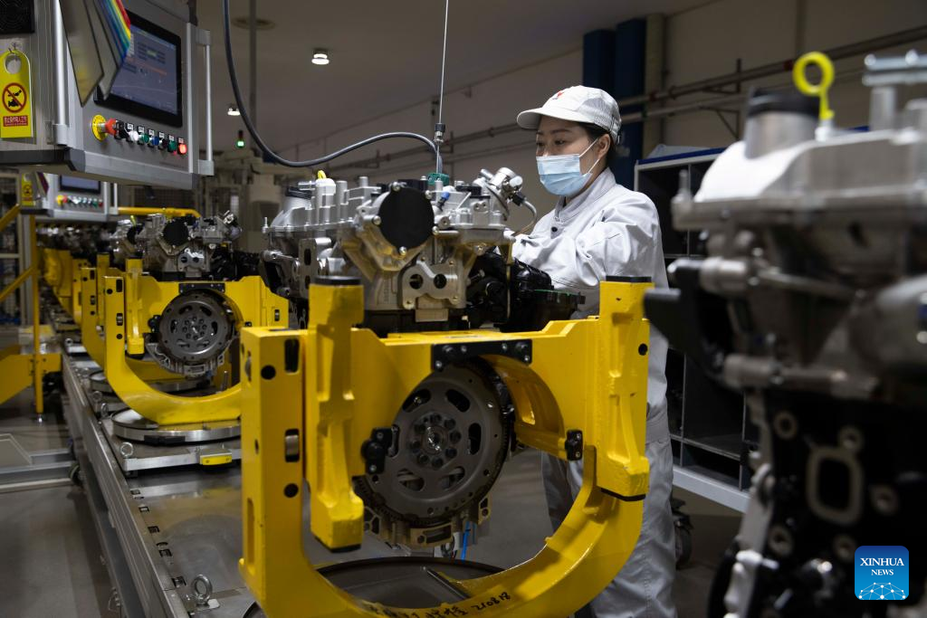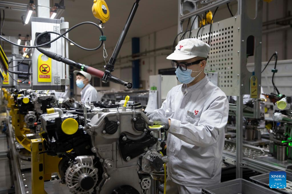 Staff members work at Dongan Auto Engine Co., Ltd. in Harbin, northeast China's Heilongjiang Province, March 23, 2022. Manufacturing firms above a designated size have been facilitating production with epidemic control and prevention measures in Harbin, as an effort to minimize the impact of the COVID-19 on economic and social development. (Xinhua/Zhang Tao)