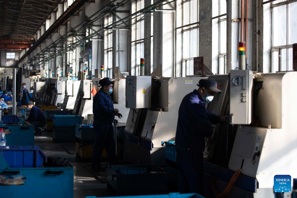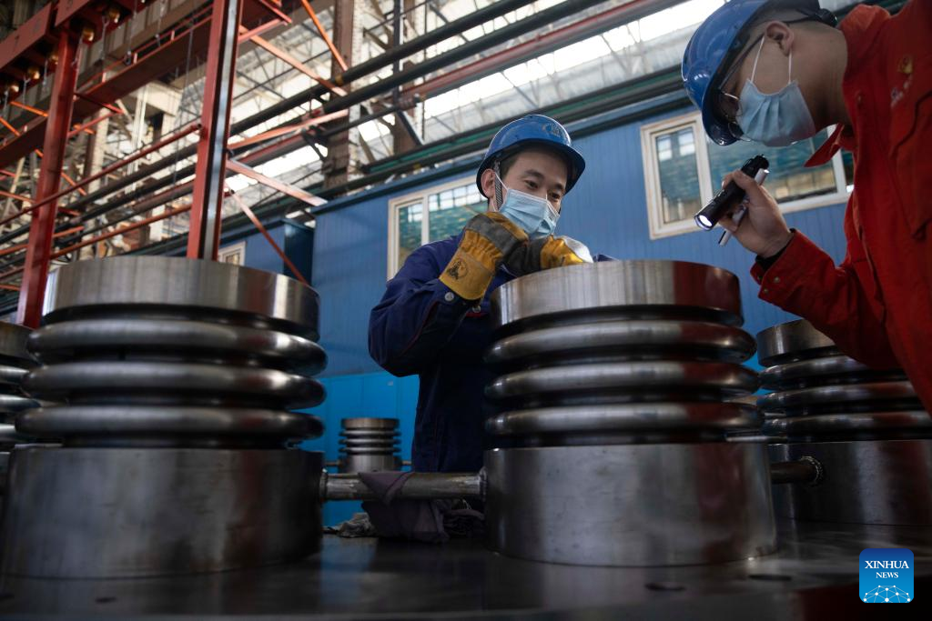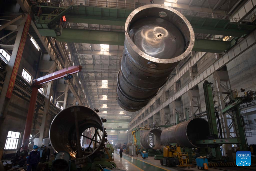 Staff members work at Harbin Boiler Company Ltd. of Harbin Electric Corporation in Harbin, northeast China's Heilongjiang Province, March 23, 2022. Manufacturing firms above a designated size have been facilitating production with epidemic control and prevention measures in Harbin, as an effort to minimize the impact of the COVID-19 on economic and social development. (Xinhua/Zhang Tao)
