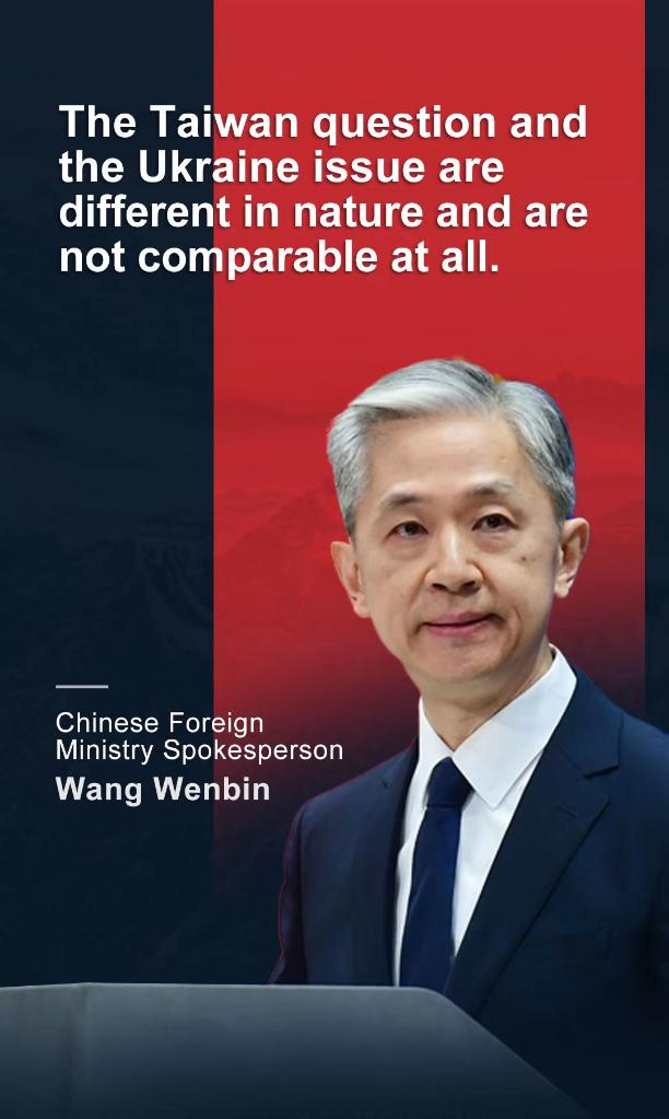 The Taiwan question and the Ukraine issue are different in nature and are not at all comparable, Wang said, noting that Taiwan falls under China's internal affairs and has nothing to do with Japan.