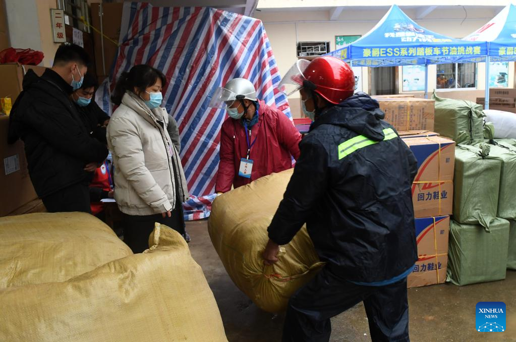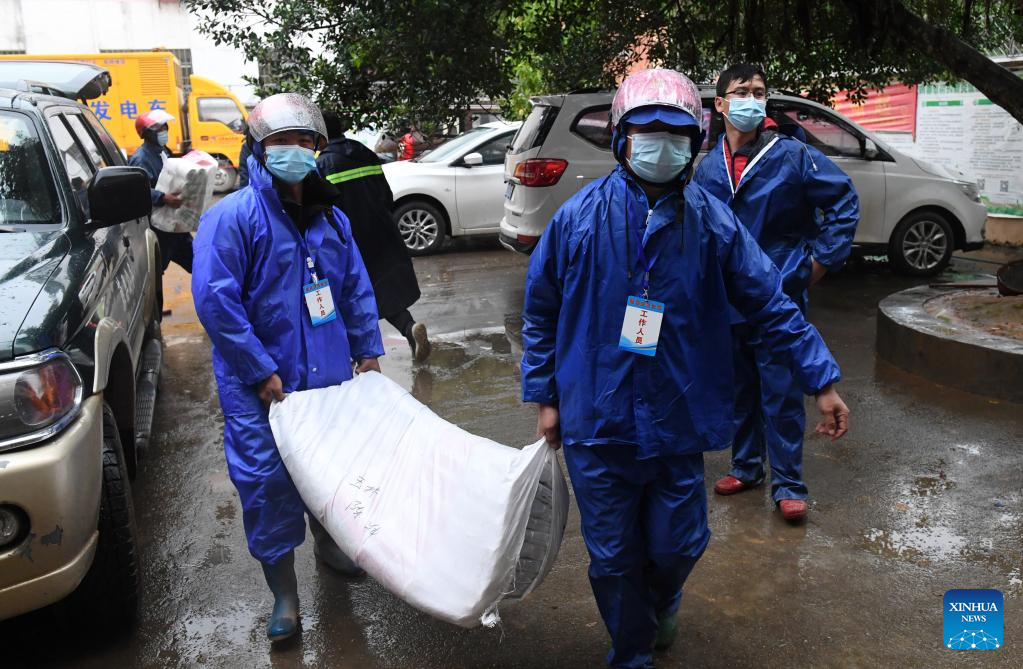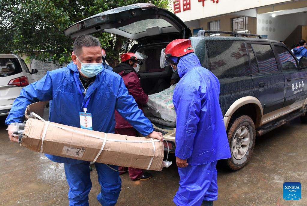 Staff carry supplies in Molang Village of Tengxian County, south China's Guangxi Zhuang Autonomous Region, March 23, 2022. A passenger plane carrying 132 people on Monday crashed into a mountainous area near Molang Village in Tengxian County. More than 2,000 people have joined the rescue operation at the site. (Xinhua/Lu Boan)