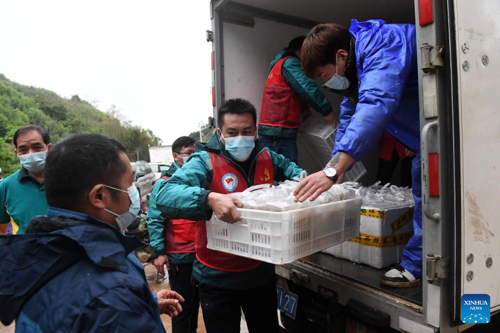 Staff carry food for rescuers in Molang Village of Tengxian County, south China's Guangxi Zhuang Autonomous Region, March 23, 2022. A passenger plane carrying 132 people on Monday crashed into a mountainous area near Molang Village in Tengxian County. More than 2,000 people have joined the rescue operation at the site. (Xinhua/Lu Boan)