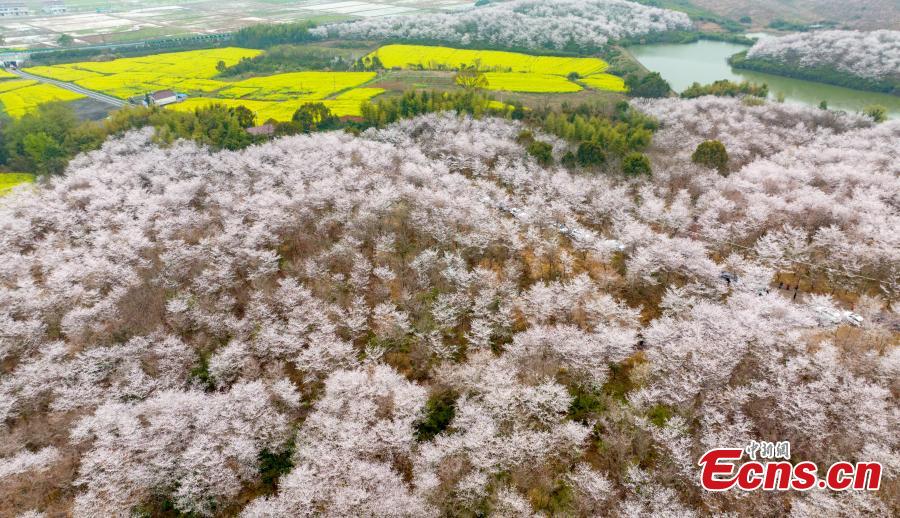 Photo shows the picturesque scenery of blooming cherry blossoms in Anhui, March 20, 2022. (Photo: China News Service/Li Xiaohong)
