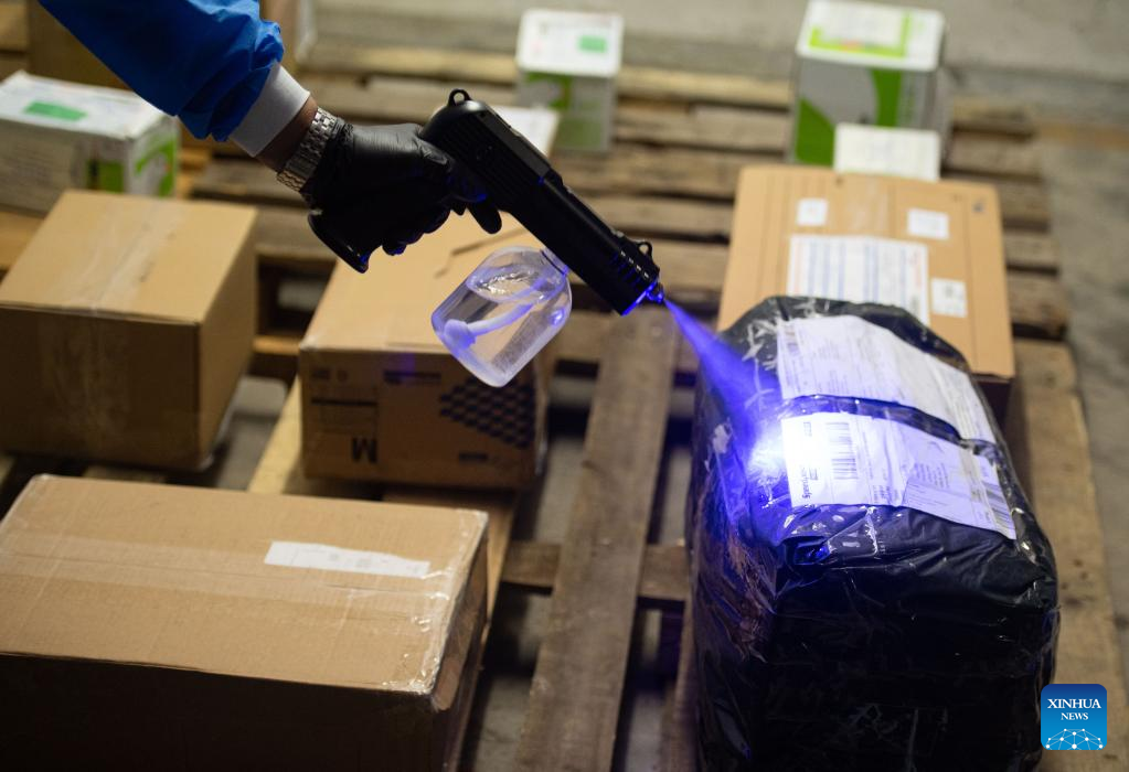 A staff member with Macao Post disinfects packages in south China's Macao, March 23, 2022. (Xinhua/Cheong Kam Ka)