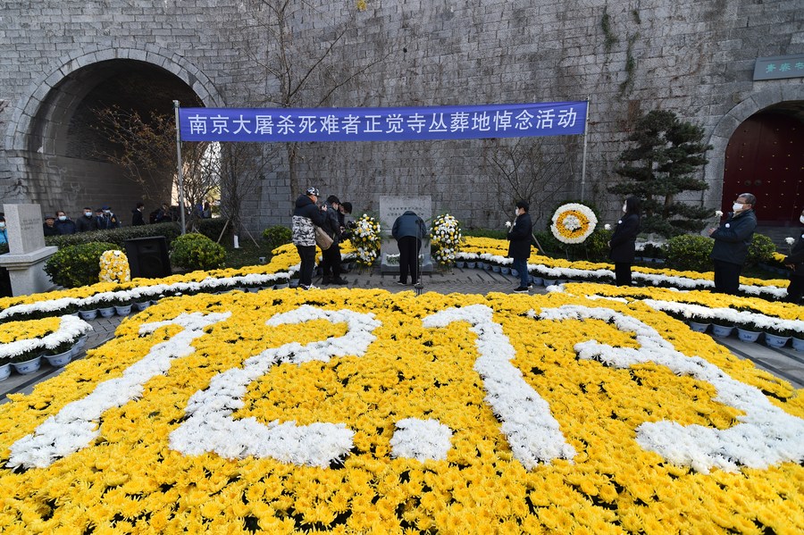 People take part in a memorial ceremony to mourn the victims of the Nanjing Massacre on the occasion of the eighth National Memorial Day in Nanjing, capital of east China's Jiangsu Province, Dec. 13, 2021. (Photo by Fang Dongxu/Xinhua)