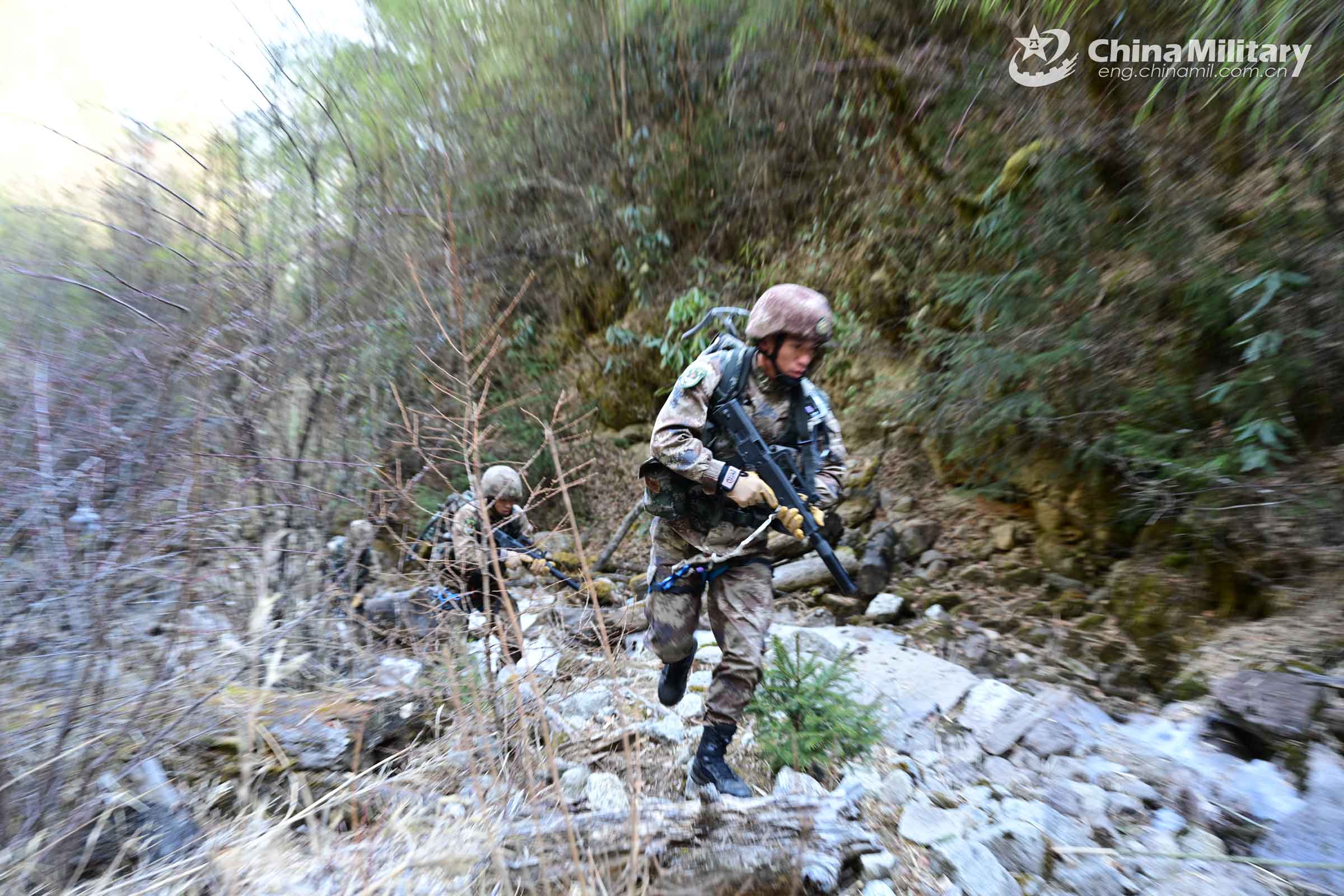Scouts assigned to a reconnaissance detachment of a brigade under the PLA Xizang Military Command run through the valley with full gears during a reconnaissance ability assessment on March 11, 2022. The assessment was aimed at verifying the troops' combat capability. (eng.chinamil.com.cn/Photo by Yang Kai)